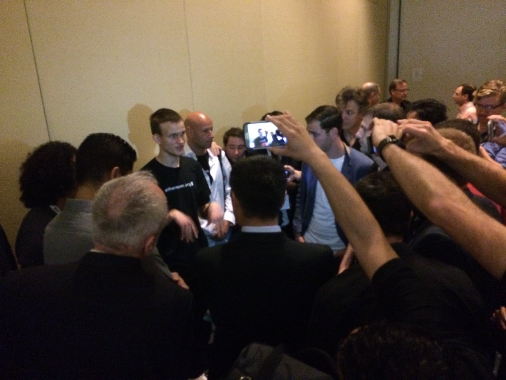 8 years ago today, #Ethereum was formally announced in Miami. After a standing-room only talk and extended line of questions, we all shuffled into a hallway to make room for the next speaker. Joe Lubin and Anthony Di Iorio can be seen next to Vitalik as the crowd encroaches - 26th January 2014