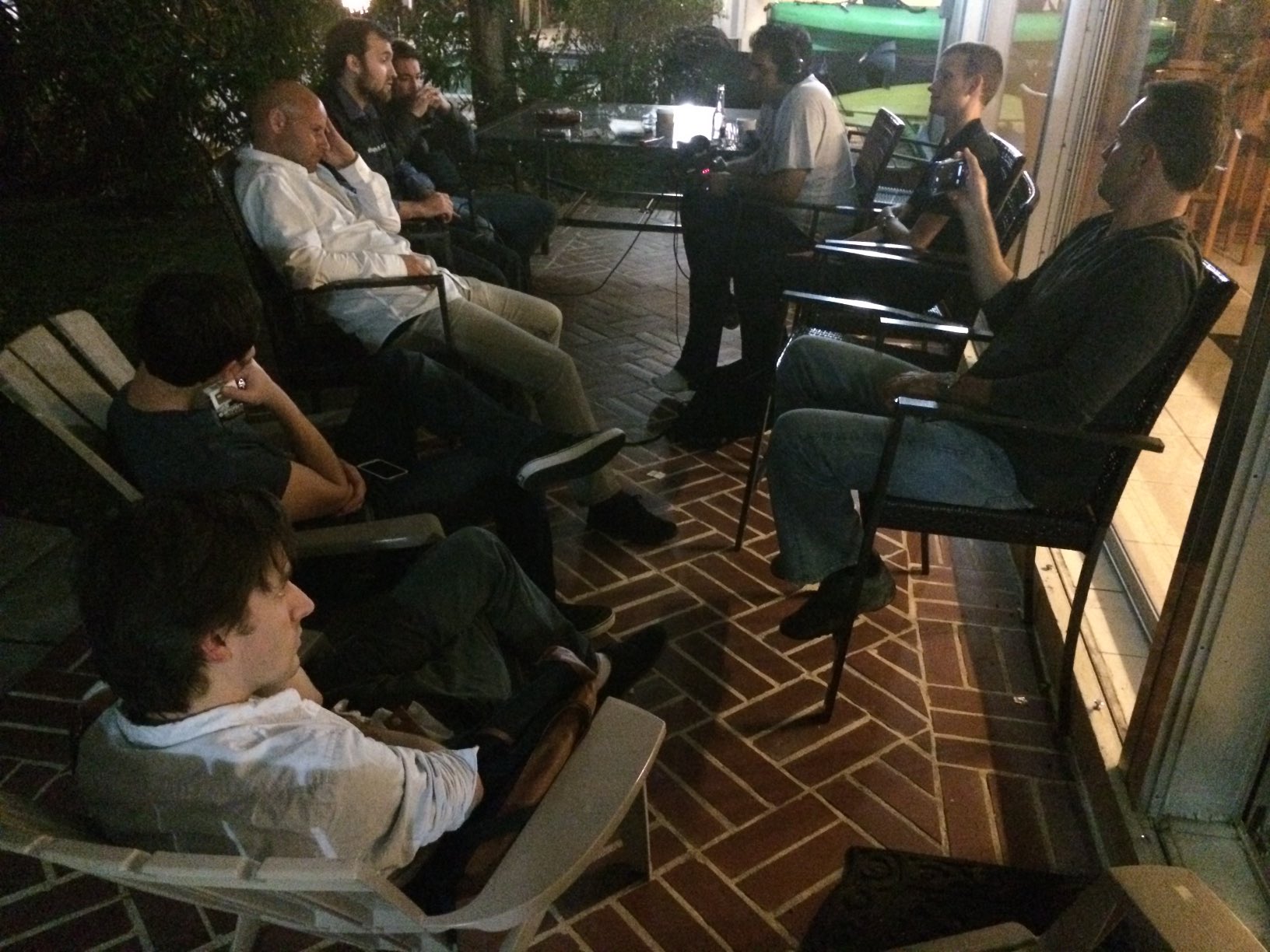Late into the night, some of our team gathered on the back patio for interviews. In addition to those named in yesterday's photo, appearing below are Charles, Joe, Jeremy, Dino, and one unidentified smoker. My hammock is back and to the left. #EthYearsAgo - 27th January 2014